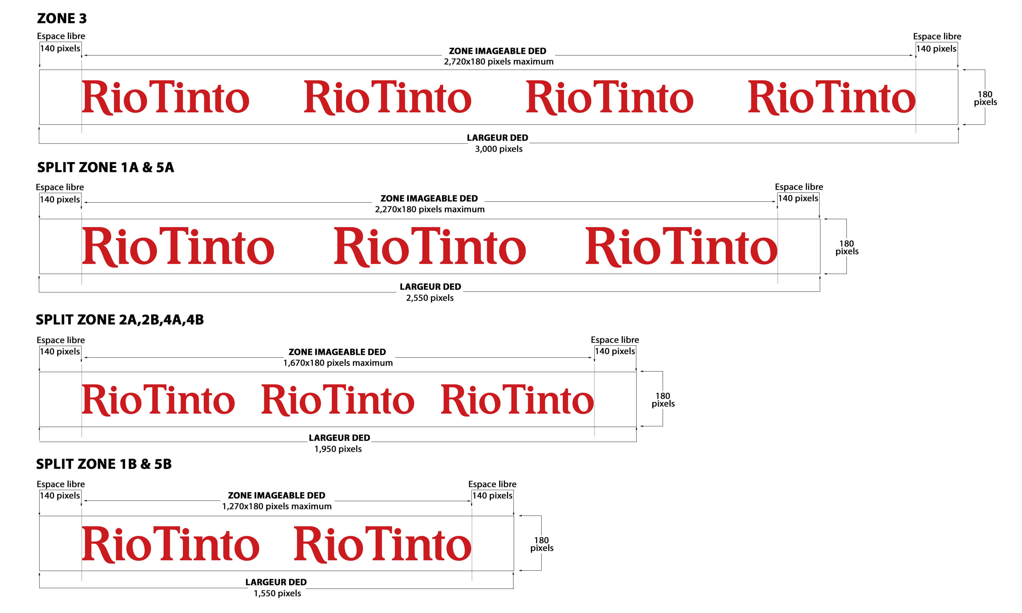 Dans la plupart des cas, la Ligue Nationale recommande que le logo/artwork DED de chaque annonceur occupe environ entre 30-70% de la zone fin d'éviter une abondance d'espaces vides dans la création ou, à l'inverse, pour s'assurer que l'espace publicitaire n'est pas trop saturé.